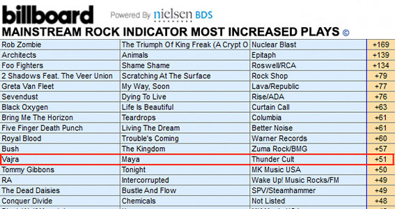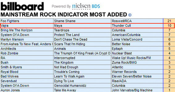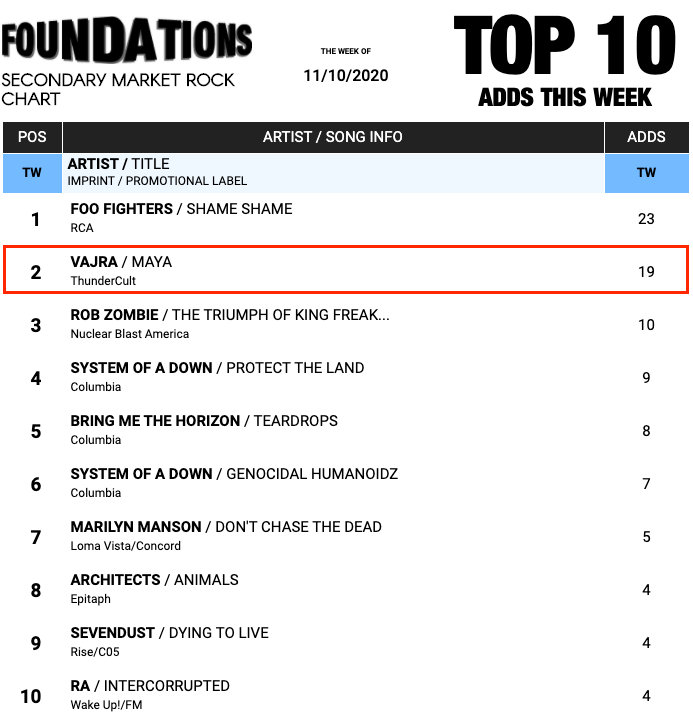 Vajra comes out of the gate firing on all six-cylinders, collecting 19 secondary market adds on impact. "Maya" takes home the #2 MOST ADDED spot on the Billboard (BDS) Mainstream Rock Indicator chart and grabs the #2 MOST ADDED spot on the Foundations chart. "Maya" also grabs a spot among the GREATEST GAINERS on both the Billboard Indicator and Foundations charts this week.